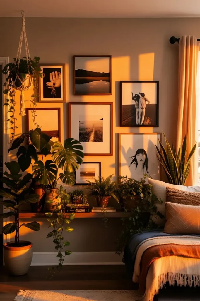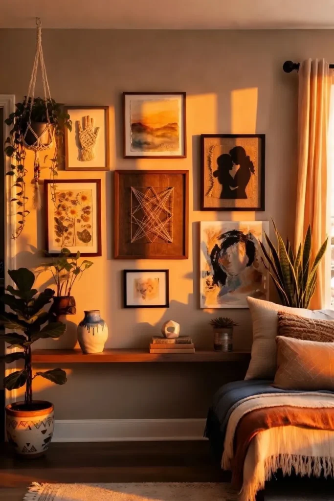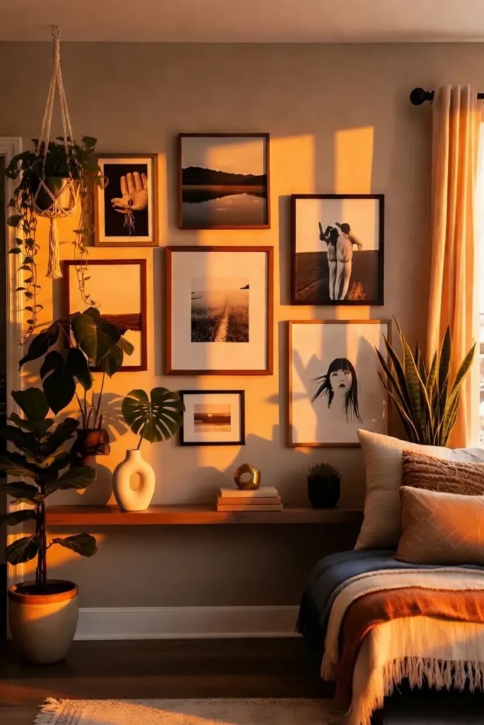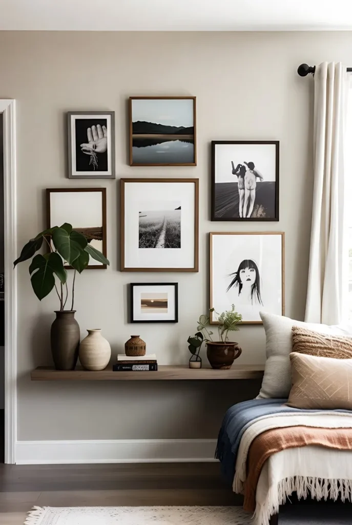 The beauty of a gallery wall is that it requires very little investment to create a big visual impact. Start by collecting frames from thrift stores, discount shops, or even repurposing frames you already own. Paint them all the same color — classic black, crisp white, warm gold, or matte terracotta are all on-trend choices this year — to create cohesion even when the frames themselves are different shapes and sizes.