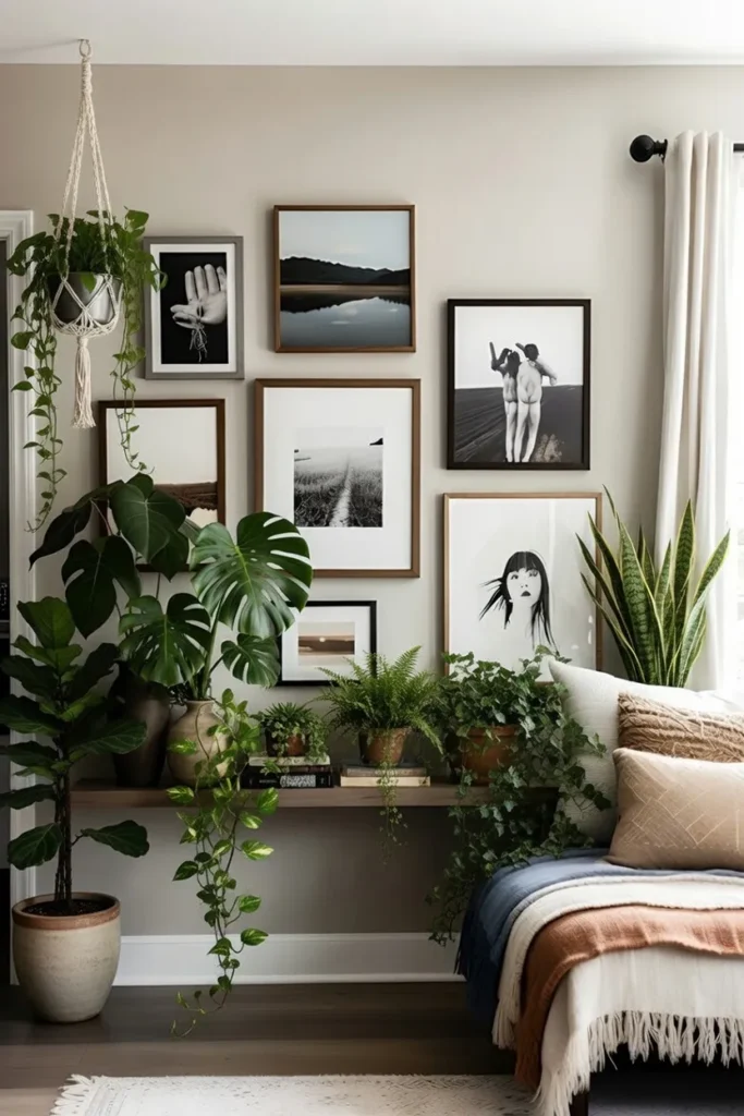 Arrange plants at different heights to create visual interest. Use a plant stand or stool to elevate some plants, hang trailing varieties in macrame hangers from the ceiling, and cluster smaller pots on shelves or side tables. This layered approach mirrors the natural world and creates a lush, cohesive look throughout the room.