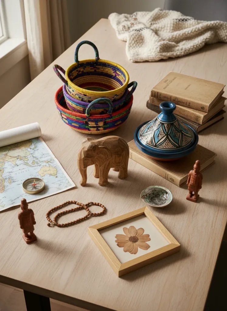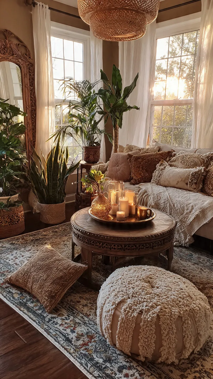 A bohemian living room tells a story of global wanderlust through the objects it displays. Moroccan wedding blankets, Indian block-printed textiles, Turkish kilim poufs, African mud cloth cushions, and Balinese carved wooden panels all bring a sense of cultural richness and free-spirited decor energy to the space. In 2026, intentional and respectful incorporation of global craft traditions is a defining characteristic of mature boho aesthetic interiors — the emphasis is on supporting independent artisans and celebrating craft heritage. Display these treasured pieces prominently as the meaningful, story-rich objects they are within your boho home decor.