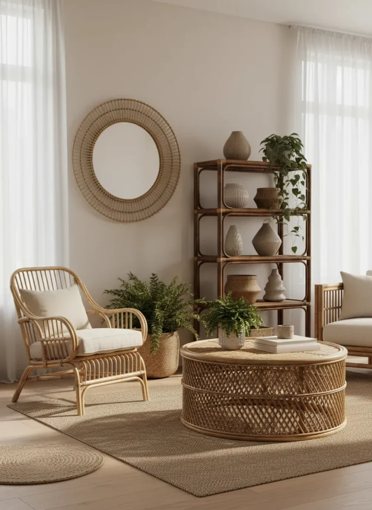 Natural materials are the backbone of boho interior design, and rattan and bamboo furniture pieces are among the most versatile and beloved choices. A rattan side table, a bamboo bookshelf, or a woven rattan accent chair each contribute to the organic, earthy character of boho living room decor without overwhelming the space. In 2026, rattan furniture has evolved beyond the classic natural tone — painted rattan pieces in matte black, warm white, or terracotta are appearing in bohemian living room interiors, offering a more refined take on this beloved material while maintaining the free-spirited decor spirit that makes boho design so enduring.