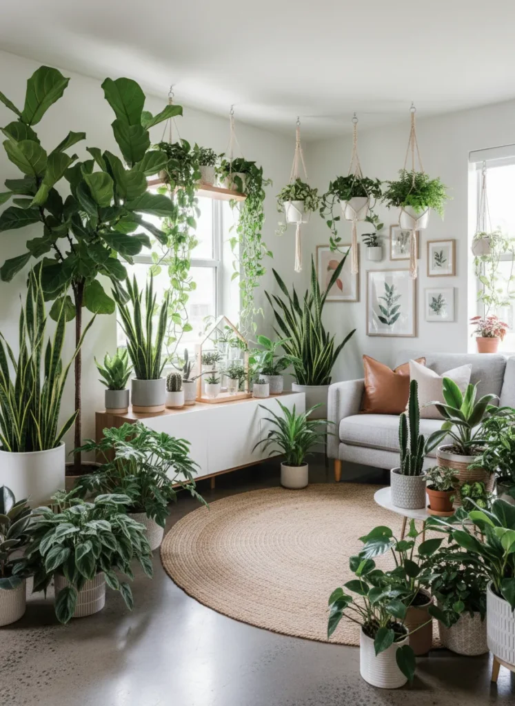 Plants are absolutely non-negotiable in boho home decor. The more greenery, the better — the boho aesthetic actively embraces a lush, almost jungle-like abundance of plant life that brings the outdoors inside and infuses the space with natural energy. In 2026, popular plant choices for a bohemian living room include trailing pothos in macramé hangers, dramatic fiddle leaf figs in terracotta pots, monstera deliciosa as corner statement plants, and clusters of succulents on shelves and windowsills. Choose your planters thoughtfully — terracotta, hand-painted ceramics, woven baskets, and hammered metal containers all contribute to the layered textures decor story of the room.