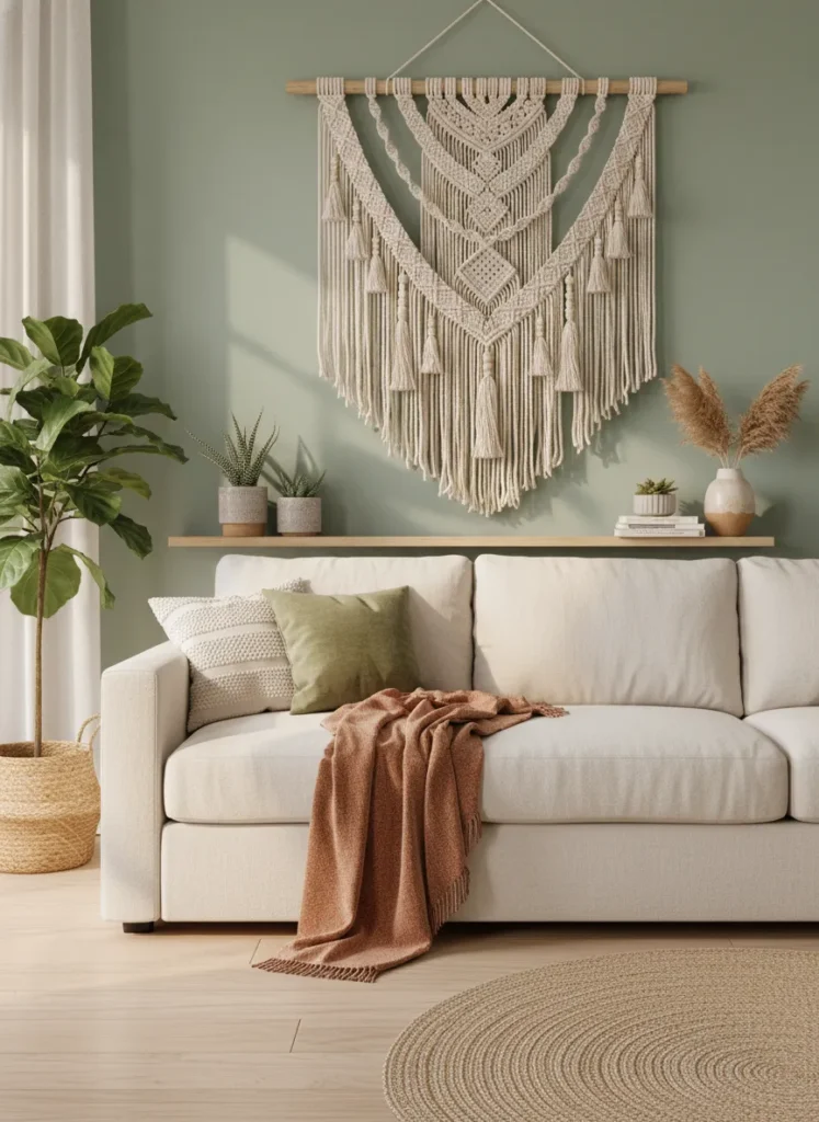 Nothing communicates boho aesthetic more immediately than a large macramé wall hanging. Positioned above the sofa, a hand-knotted macramé piece becomes the focal point of the entire room — textural, warm, and unmistakably bohemian. In 2026, macramé wall art has evolved beyond simple fringe panels into intricate woven sculptures incorporating feathers, beads, driftwood, and natural dyes. For a truly authentic boho home decor look, seek out pieces made by independent artisans rather than mass-produced versions. The slight irregularities of handmade work add a soulfulness that elevates the entire boho interior design of your space.