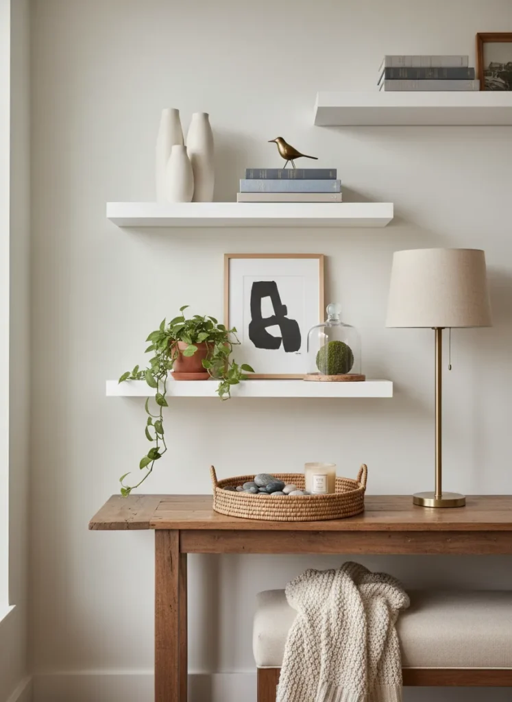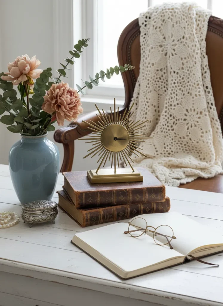In boho interior design, every surface is an opportunity for storytelling. Bookshelves, coffee tables, windowsills, and mantels all become stages for carefully composed vignettes that are the visual punctuation of free-spirited decor. A shelf vignette might include a tall brass vase, a trailing plant, a stack of well-worn books, a small stone sculpture, and a bundle of dried pampas grass. A coffee table vignette could feature a hammered metal tray holding a candle, a crystal cluster, and a small ceramic bowl. These bohemian decor ideas for surface styling are what give a boho home decor scheme its layered, lived-in quality that no single statement piece can achieve alone.