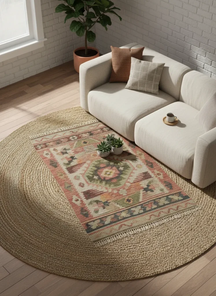 The rug is the single most powerful foundation piece in any boho living room decor scheme. In 2026, the most popular approach is layering — placing a smaller vintage kilim, Persian, or Moroccan rug on top of a larger jute or sisal base rug. This instantly creates that signature layered textures decor effect that makes a bohemian living room feel richly collected and deeply personal. Choose a kilim with warm terracotta, rust, and cream tones to anchor the earthy palette of your boho home decor. The contrast between the natural woven jute and the patterned vintage layer adds visual depth that no single rug can achieve on its own.