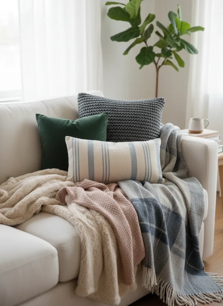 Layered textures decor is the heart and soul of a bohemian living room, and nowhere is this more visible than in the layering of throw pillows and blankets across the sofa and seating. The rule in boho home decor is that more is more — pile on pillows in varying sizes, shapes, and fabrics. Mix velvet against linen, embroidered cotton beside woven wool, tasseled cushions alongside block-printed ones. Blankets in chunky knit, vintage kantha, or Moroccan wedding blanket style draped casually over the arm of the sofa complete the effect. In 2026, warm terracotta, dusty sage, deep plum, and cream are the palette leaders for boho aesthetic textiles.
